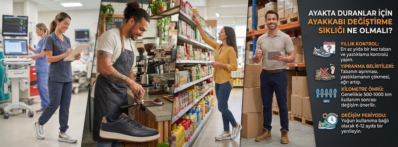 Uzun süre ayakta duranlar için tabanlık değişim sıklığı da önemlidir. Yoğun kullanımda tabanlıklar altı ila dokuz ayda bir değiştirilmelidir; aksi hâlde destek özellikleri kaybolur ve orijinal konfor hissi azalır.